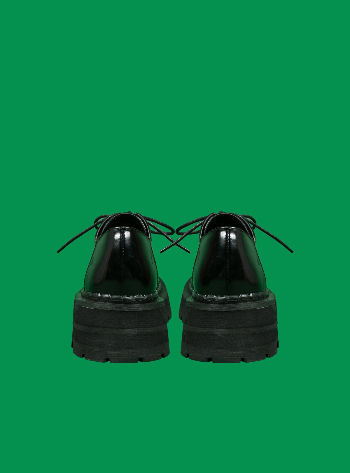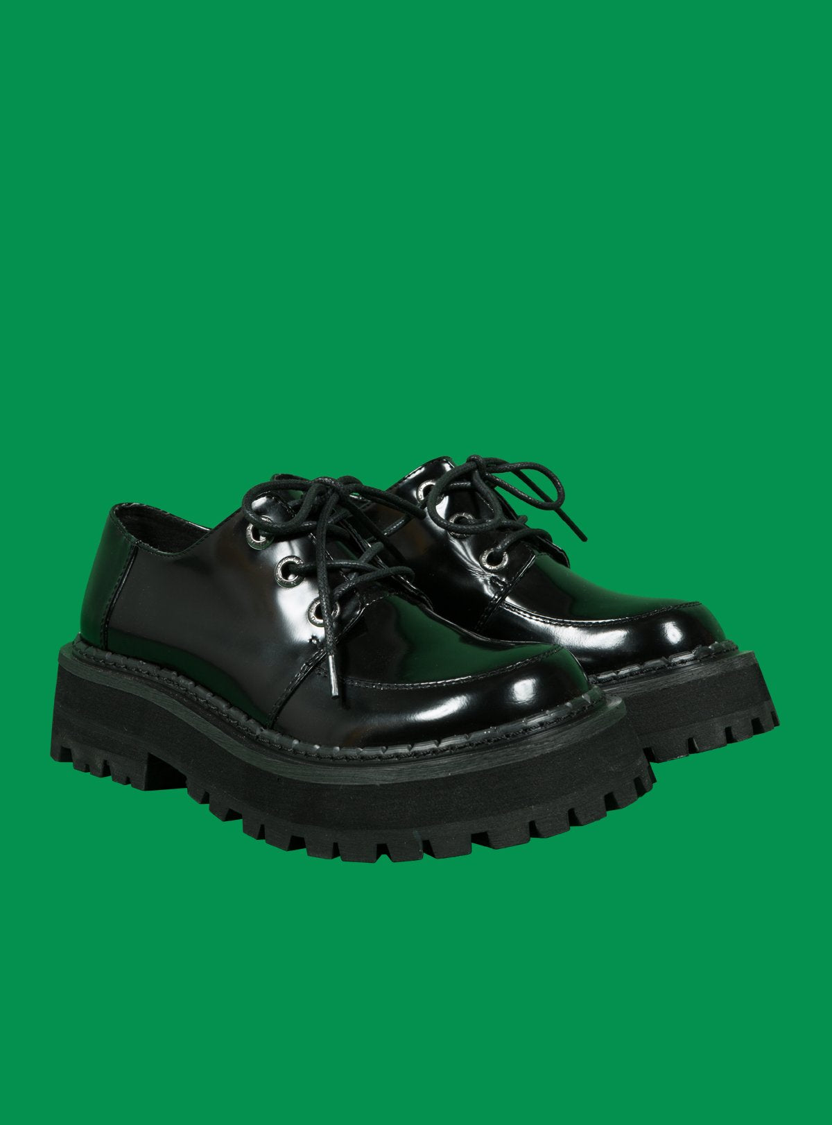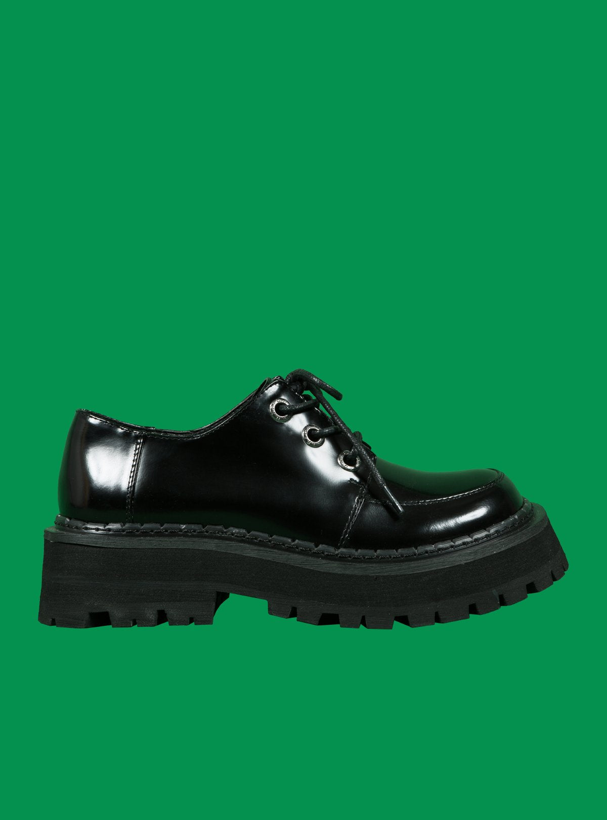 Low top, shiny box leather oxford with branded metal eyelets and a heavyweight chunky rubber sole. 1.75" heel to 1.25" platform in front. Fit is true to size.