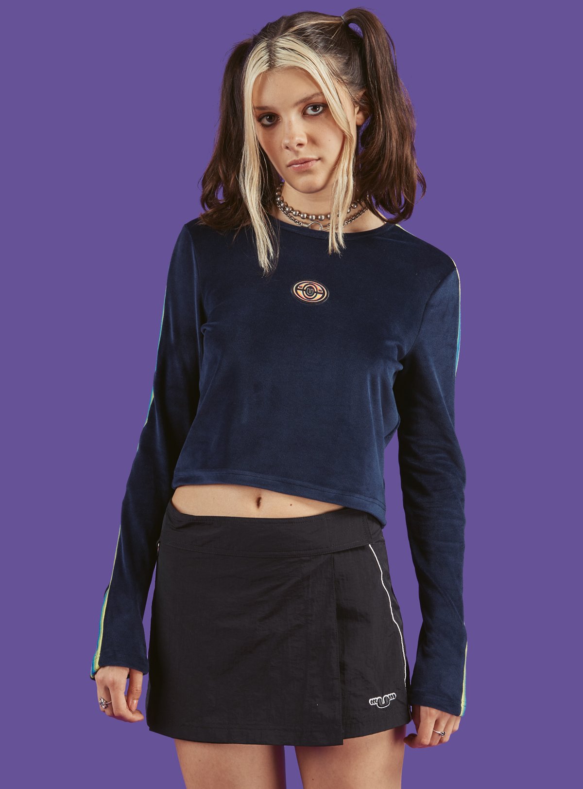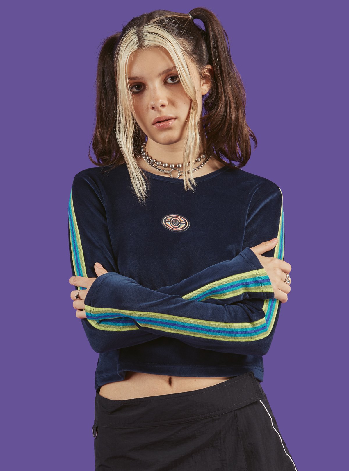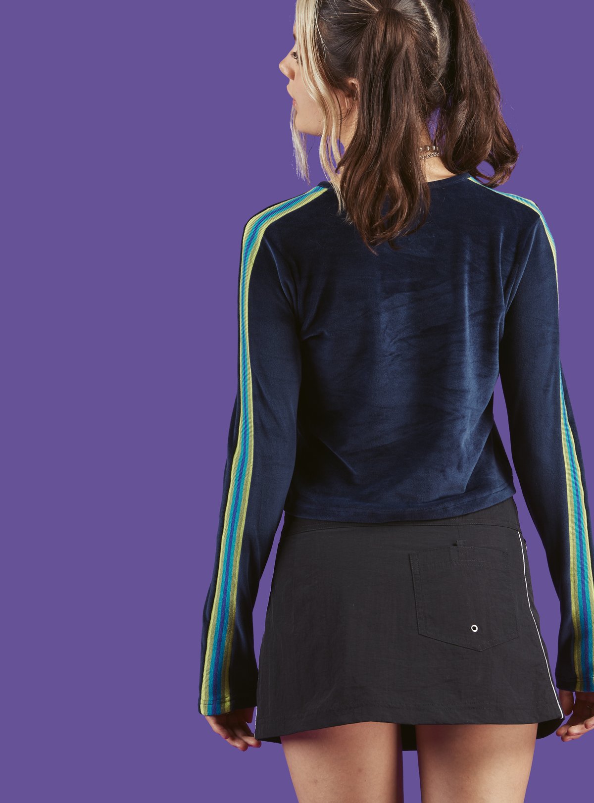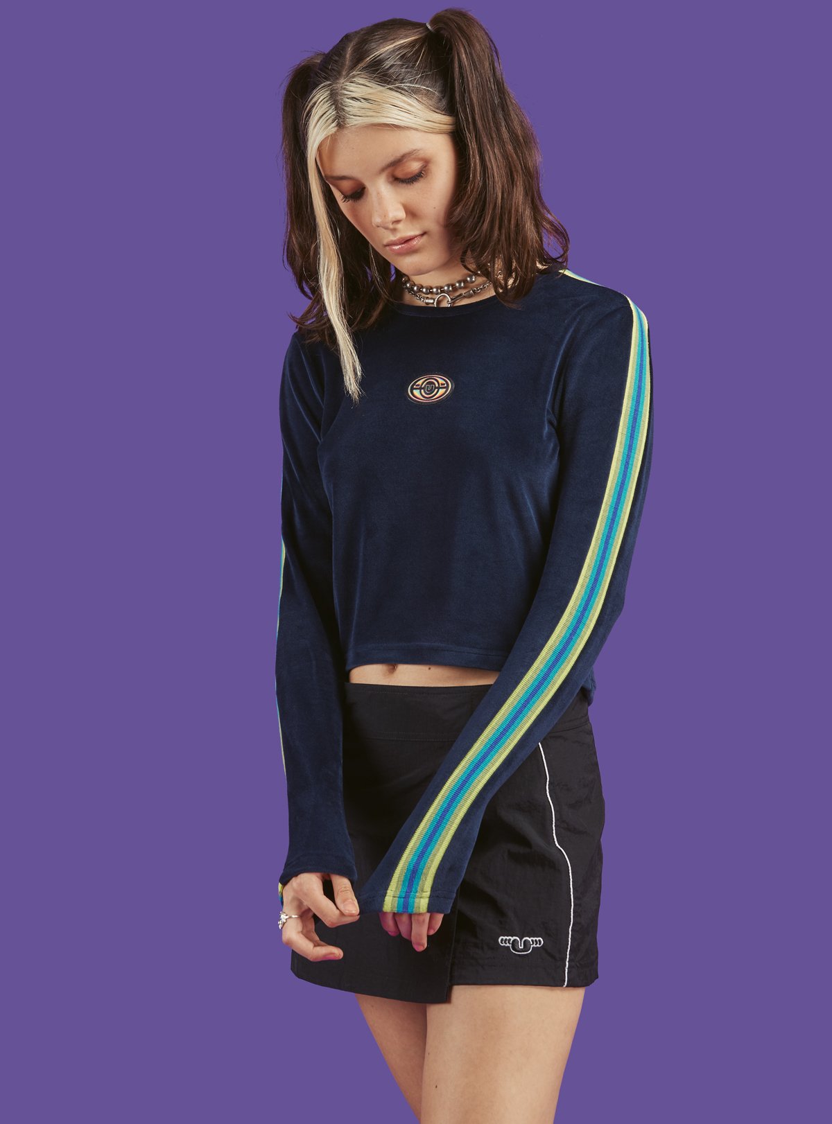 Velour logo top with knit stripe detailing and an iridescent rubber label on the chest.