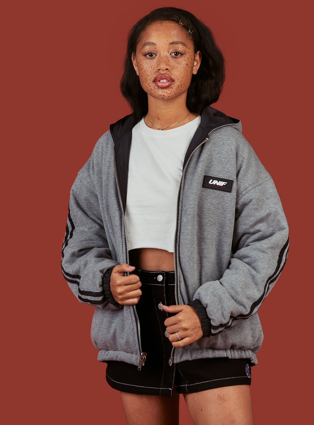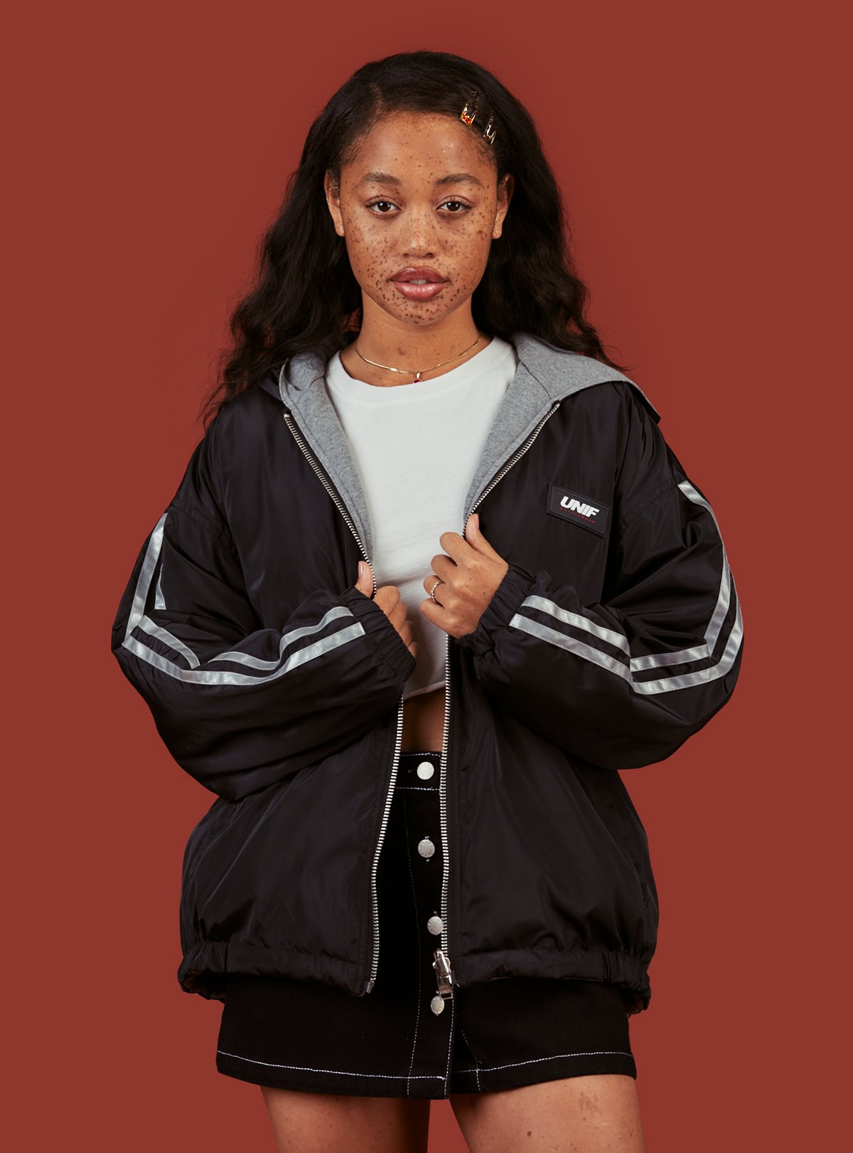 Reversible sportswear jacket (no sports required, or desired TBH). UNIF sportswear patch branding on the chest with reflective stripe detailing on the arms (blackside). Full zip front with front welt pockets and a hood. Fit is oversized but we recommend taking your normal size.