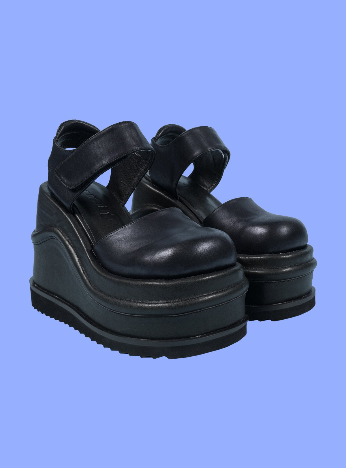 Buttery soft leather platforms with a velcro ankle strap and blunt 90s toe. Padding on back of the ankle strap for a super cozy fit and feel.